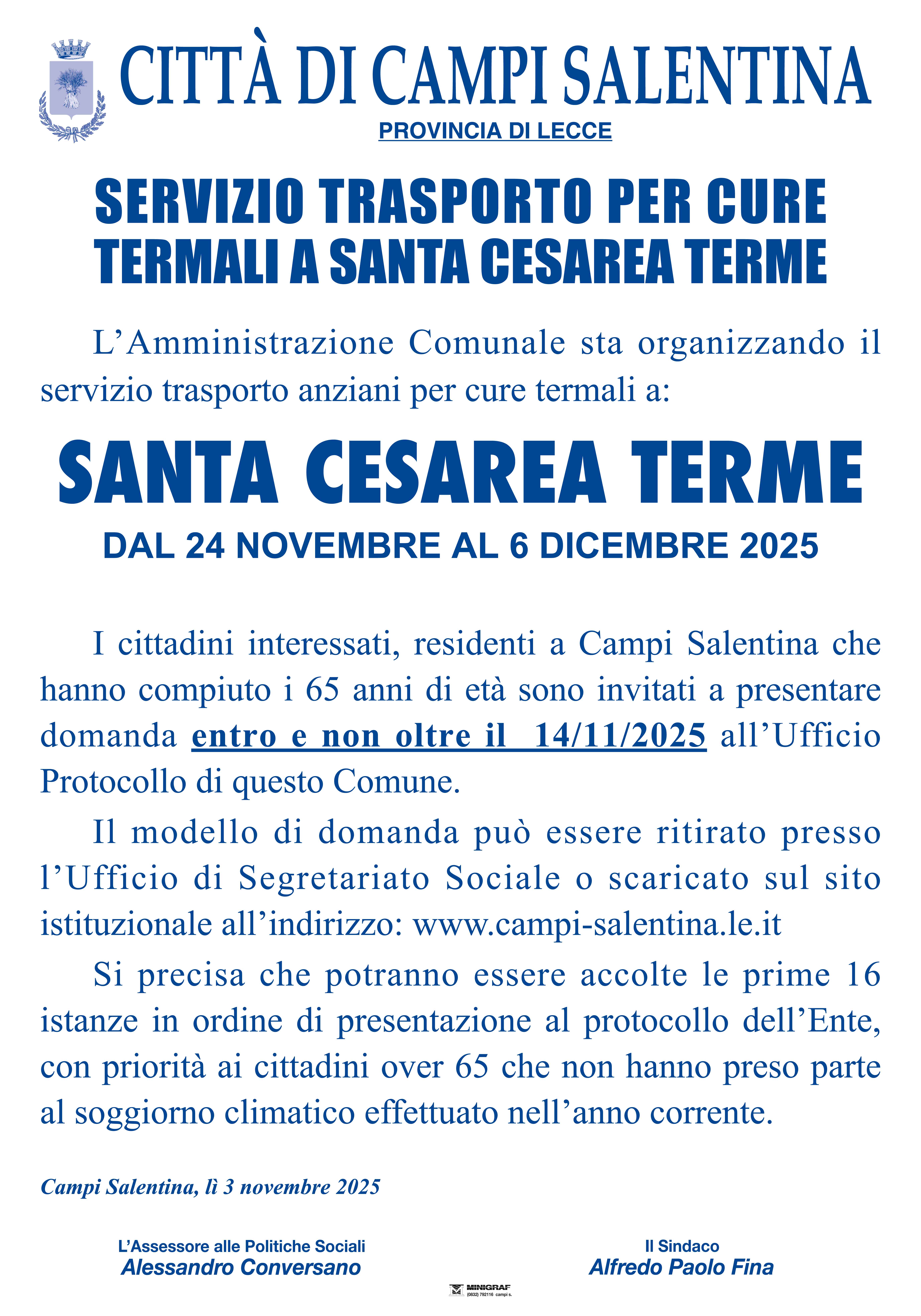 Descrizione I cittadini interessati, residenti a Campi Salentina, sono invitati a presentare domanda entro e non oltre il 14/11/2025.
